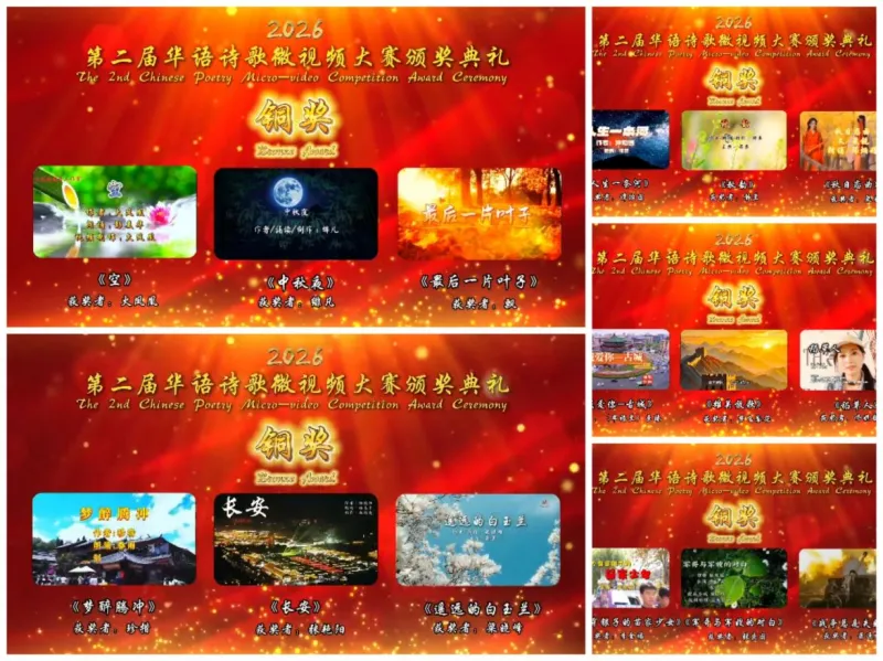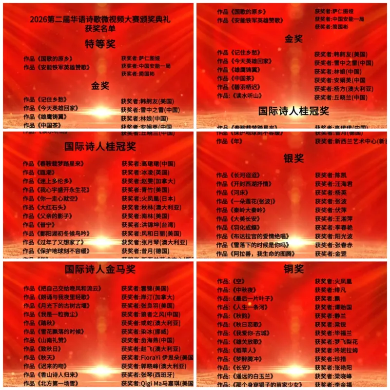 大赛期间,共征集海内外优质诗歌微视频作品超百部,经评审委员会多轮严格甄选、层层把关,一批兼具文学美感与影像匠心的精品佳作脱颖而出、荣耀出圈。赛事奖项设置丰富多元,特设特等奖、金、银、铜奖及国际诗人桂冠奖、国际诗人金马奖等重磅荣誉,以表彰优秀创作、激励诗意表达。整场线上颁奖典礼庄重热烈、诗意盎然,完整获奖名单同步在国内各大权威网络平台发布,形成强大传播声势,引发广泛关注。