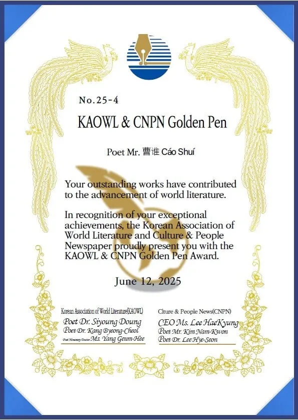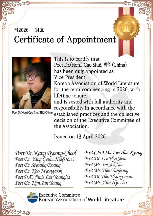 日前,中国诗人曹谁当选韩国世界文学学会副会长,韩国世界文学学会是在韩国注册的文学组织,成员遍布全球多国,得到多家大学和报刊的支持。学会每年评选韩国世界金笔文学奖,曹谁也是2025年世界金笔文学奖的得主。近年来曹谁出版51部著作,作品被翻译成36种文字,获得100多个省级以上奖项,在国际上形成广泛的影响,他倡导的大诗主义运动被翻译介绍到多国,大诗主义运动被阿拉伯媒体评为“中国文学为世界文坛的巨大贡献”。2025年曹谁就获得32个国际文学奖,新年伊始又被6个国际大学和组织授予荣誉文学博士学位。